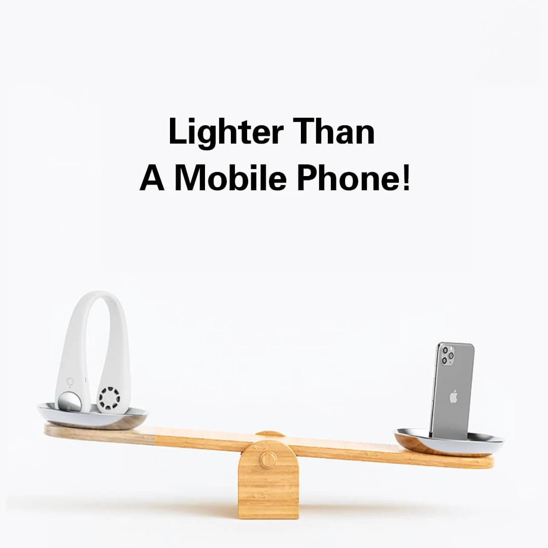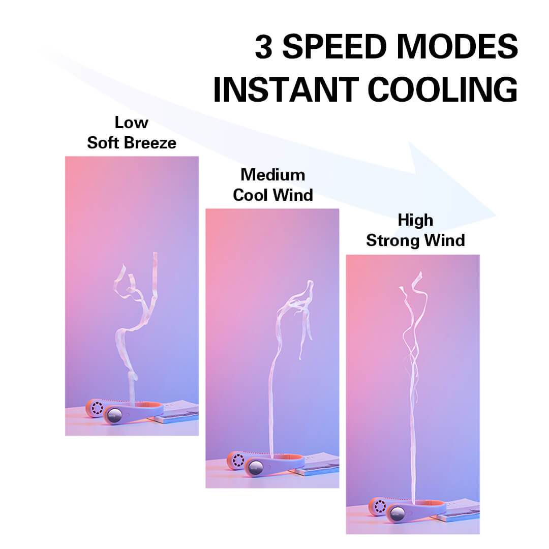This neck fan is really lightweight and I love its fashionable design. And I'm happy with the powerful airflow. Good solution to keeping cool! The neck fan can be adjusted between 3 speed modes: low. medium and high. depending on your needs. Easy to fit in my backpack. also it can be placed on the table as a desk fan. A very nice product.